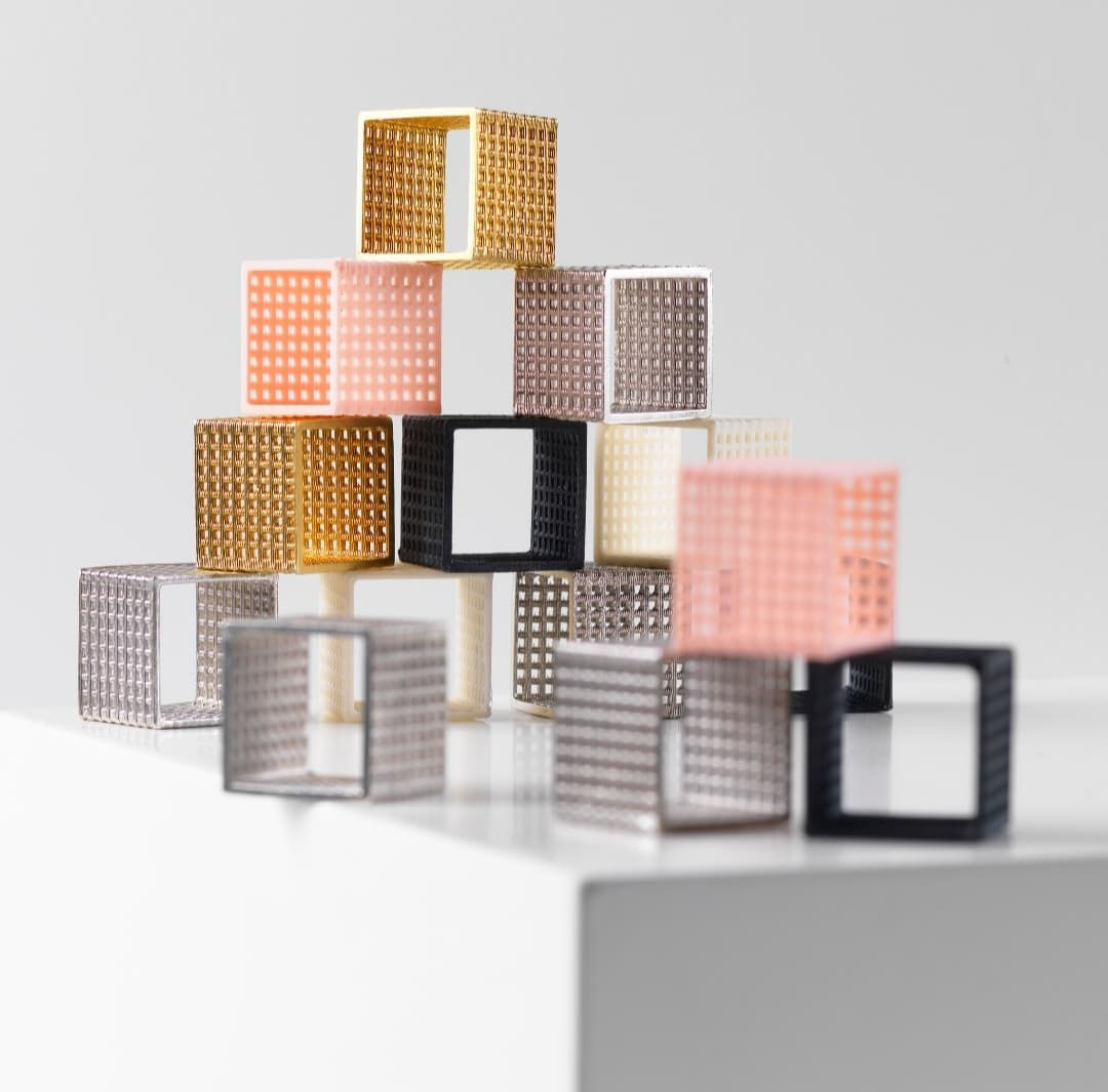 PLA plastic, oxidised & gold plated silver