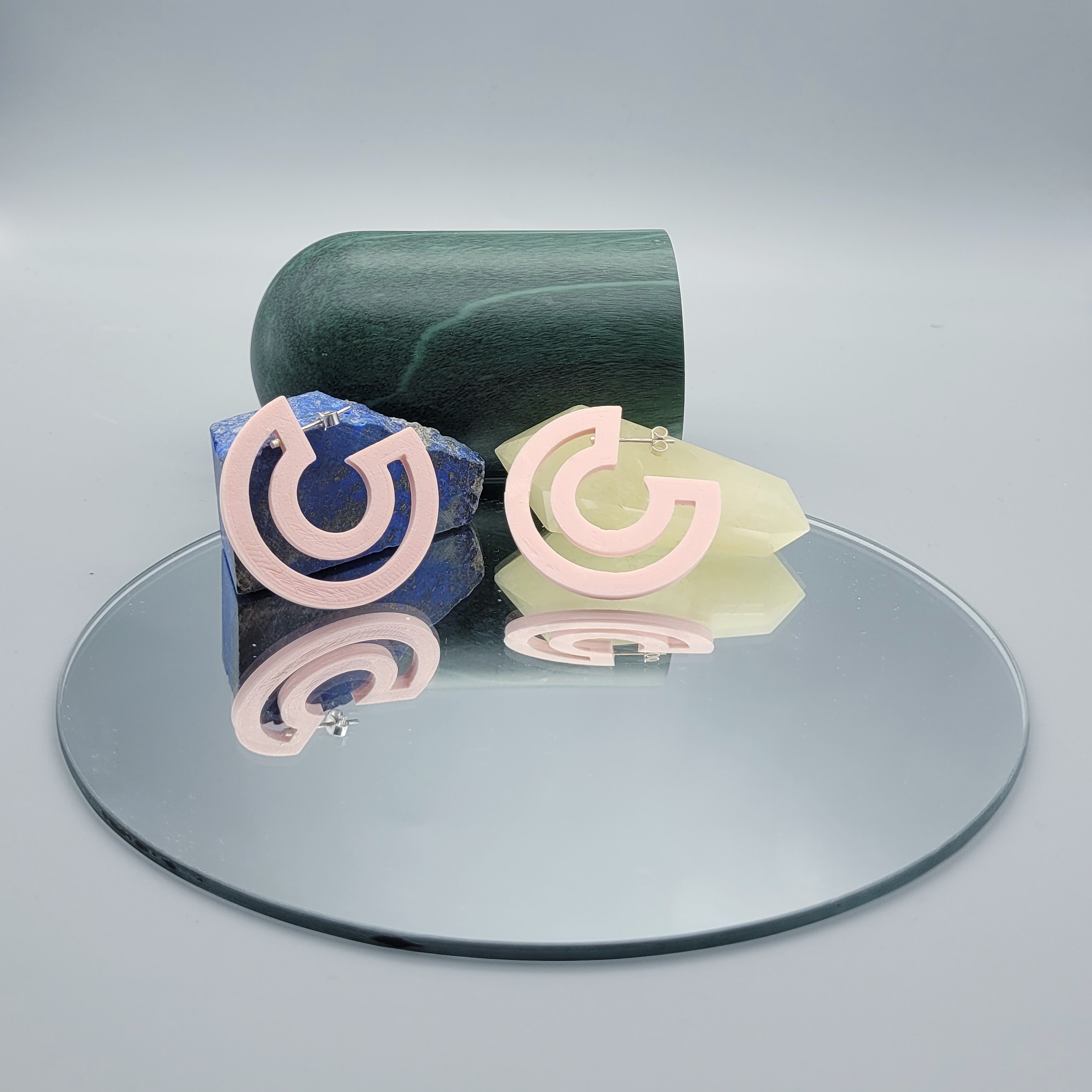 A statement pair of disk shaped hoops with a choice of colour combinations, light-weight and easy to wear.